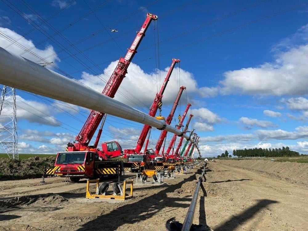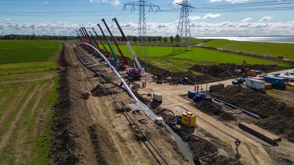En: het was ook heel imposant en spectaculair. 13 hijskranen moesten de 460 meter lange en 80 centimeter dikke drinkwatertransportleiding op de juiste hoogte houden en ‘begeleiden’ gedurende de horizontale boring. Dit nieuwe stuk leiding komt uiteindelijk op 18 meter diepte te liggen.